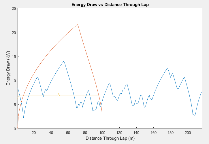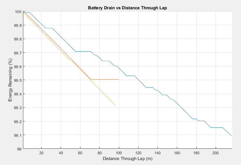 Using the power usage from the Energy Draw graph (1.7), and knowing the capacity of the battery, we can simply drain the battery of the appropriate energy levels throughout the lap by multiplying the power usage at each point multiplied by the time spent at each point.