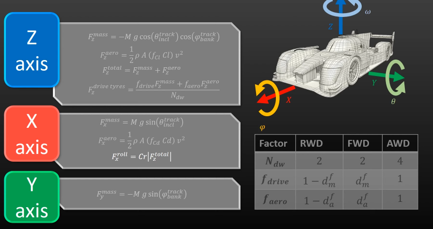- The specifications of the aero surfaces: Drag & downforce coefficients, and surface area.