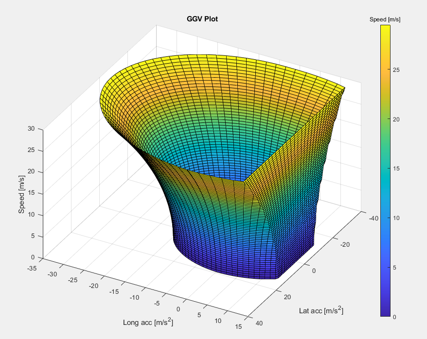A GGV map is useful for calculating the maximum acceleration the car can produce, in every direction, for any velocity. It is useful to calculate these values beforehand, as it saves computing power by not re-computing the values for each iteration of the car's position, and has the added benefit of describing the characteristics of a car without needing its actual attributes.