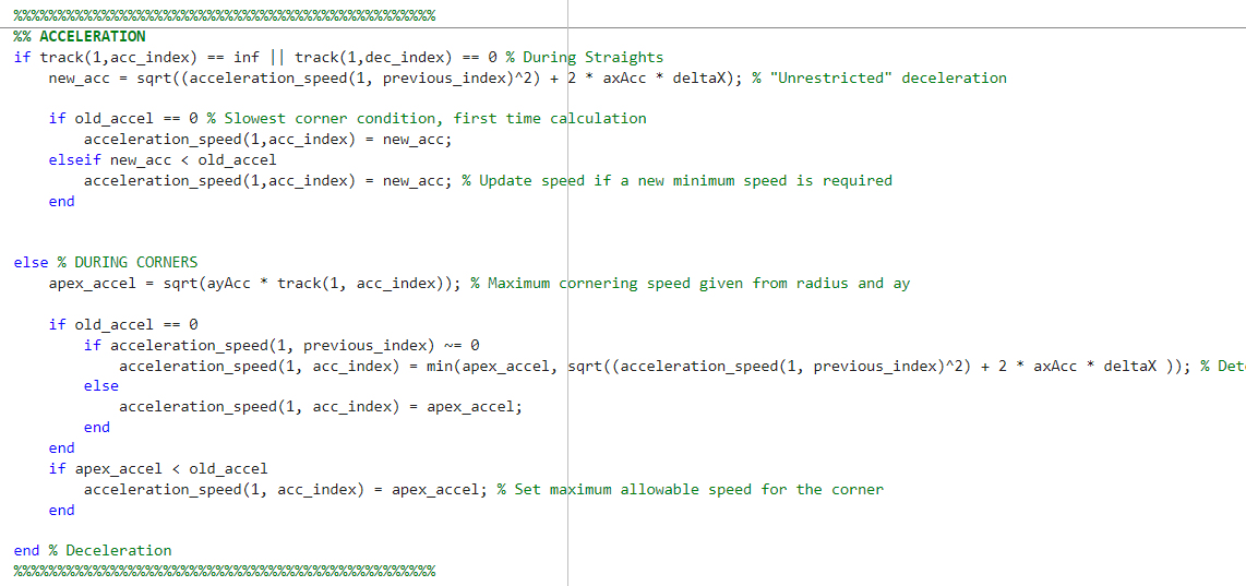 The "for" loop starts at velocity 1, calculates the maximum positive and negative lateral and longitudinal accelerations, then stores them in their respective arrays. The "for" loop then moves on to the next velocity, and calculates the maximum positive and negative lateral and longitudinal accelerations for that particular velocity. This acceleration should be different than the previous one when accounting for the fact that downforce (and therefore grip) increases with respect to velocity. Although this may seem counter intuitive, the brakes will act more powerfully at higher speeds due to the high downforce, and then become less powerful as the car becomes slower (such as how high-downforce cars need to trail brake in order to not lock up under braking). After the accelerations have been calculated, there will be 4 arrays for each of the 4 directions (left, right, forward, & backwards). The rest of the friction ellipse is then calculated using the equation of a standard ellipse. The combined lateral and forward acceleration data points, the sides of the ellipse, are not used for the laptime simulation, as one of the assumptions is that the car will not use combine lateral and longitudinal acceleration.