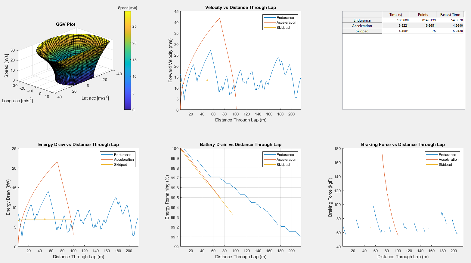 - Since the simulated lap is perfect, and many values are estimated or calculated with assumptions of their own, we expect the model to produce a performance overestimate.