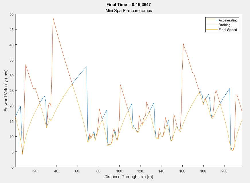 The velocity calculations consist of 2 nested for loops. The first loop iterates through a sorted array of every corner (defined as a 1m track segment with a non-infinity radius), with the tightest corner first. Starting at the slowest corner, the maximum cornering velocity is calculated using the radius of the corner and maximum lateral acceleration of the car (taken from the GGV map at the appropriate speed). From the corner, the car calculates the maximum forward velocity for the next 1m track segment, using the longitudinal acceleration calculated from the GGV. This process will continue around the entire track while ignoring corners, storing the velocity of the car at each 1m track segment in an array, until the iteration reaches the initial corner. Next, the program moves to the next tightest corner, and the process is repeated. If the calculation from this corner requires a lower speed than previously recorded in the array, the array value is overwritten with the new minimum speed for that 1m track segment. In addition, if the car reaches a corner where the maximum cornering velocity is higher than the car's current speed, the car will continue to accelerate through the corner until it reaches the maximum cornering speed. Once this process is completed for every corner on the track, you will have an array of track length, where each point corresponds to the maximum speed the car can accelerate at each point on the track. Then the process is repeated for the deceleration of the car, however the inner loop will simply loop going backwards on the track, calculating the maximum velocity for the previous track segment. At the end, the maximum speed array for the acceleration and the speed array for the deceleration are combined, taking the minimum of each value (see above graph)